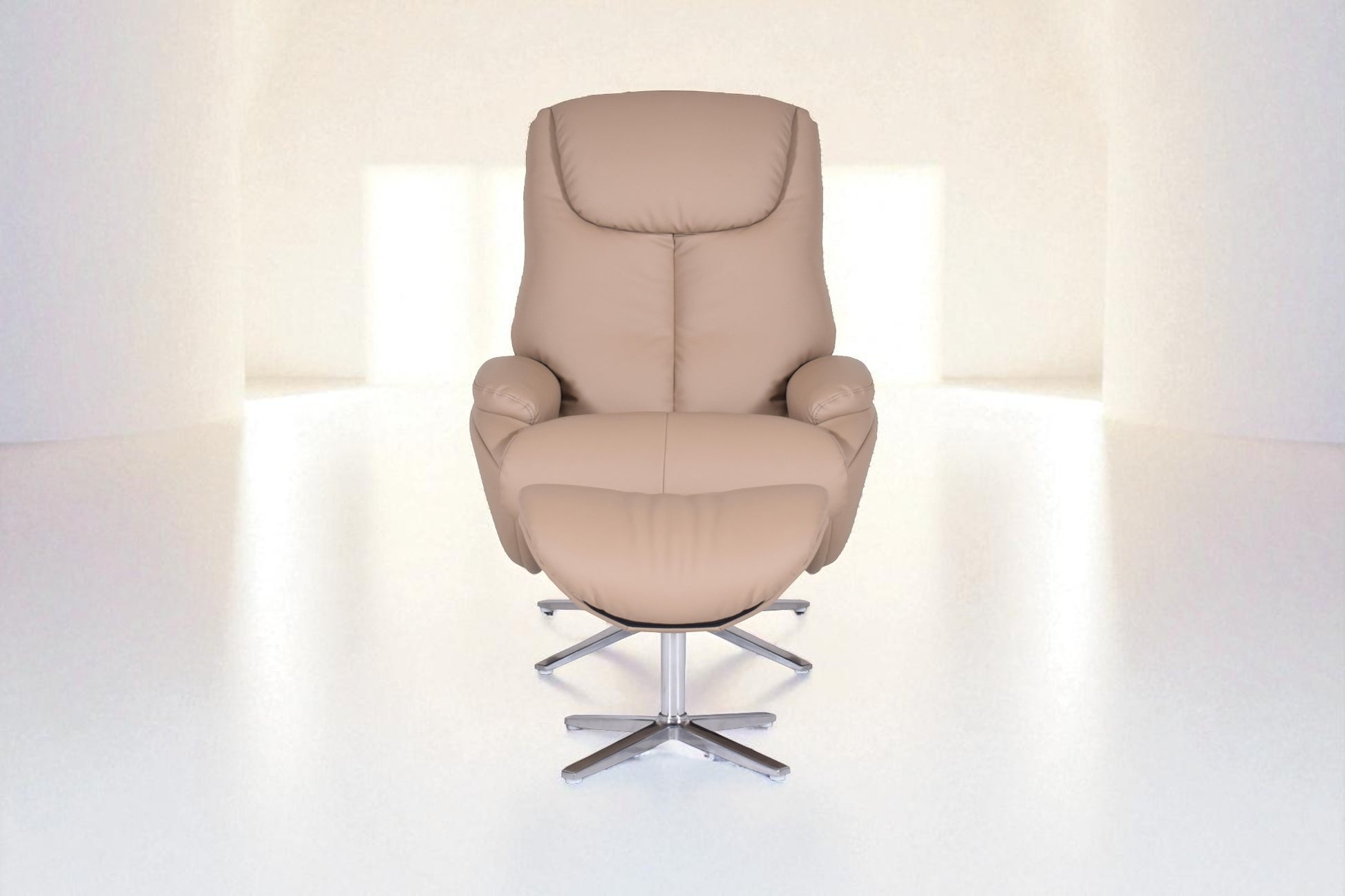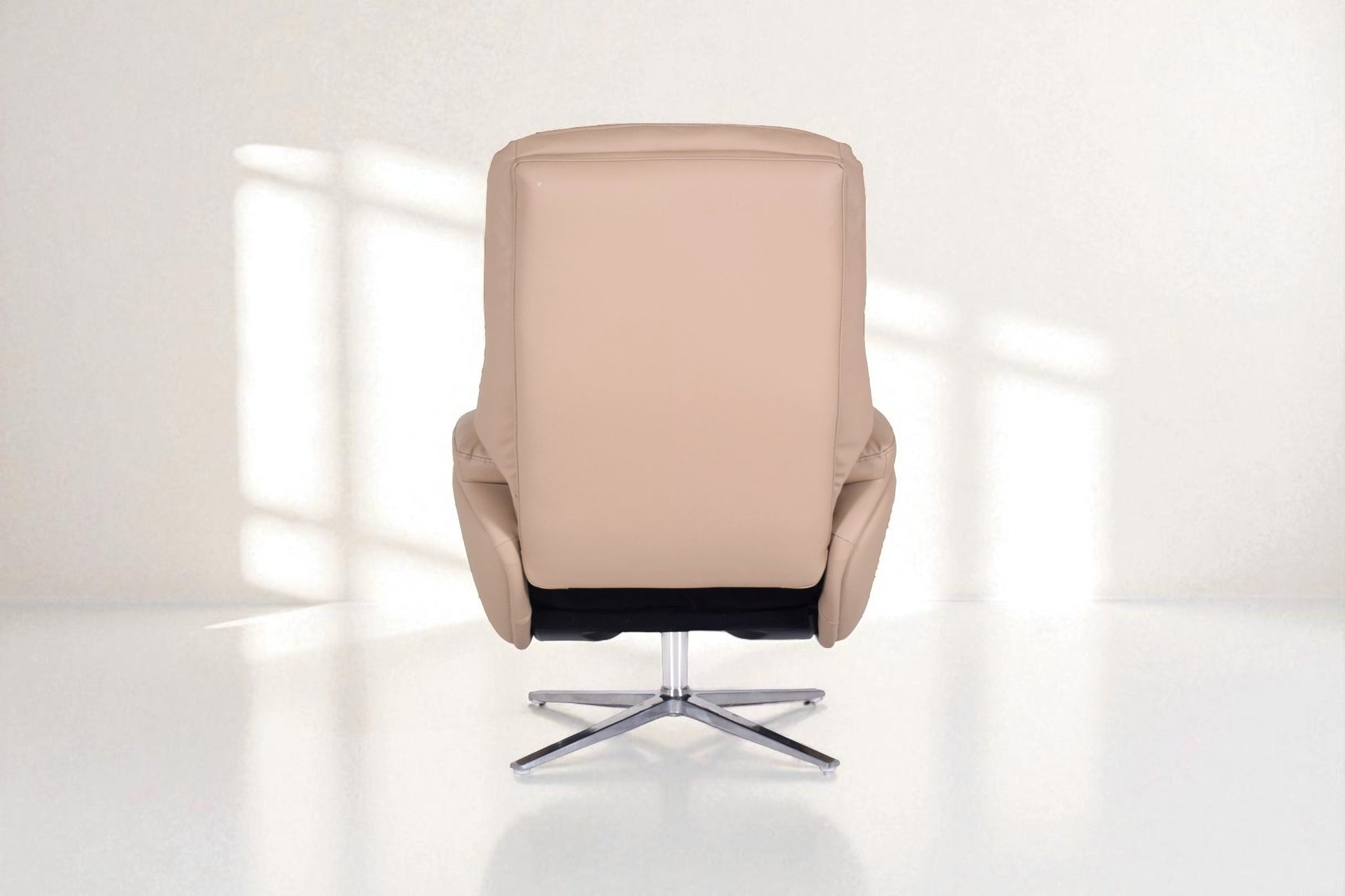 This manual recliner has an enlarged head cushion to provide that extra head and shoulder support. This faux leather upholstered recliner is a swivel glider & foot stool with stainless steel base & legs with swivel making it an ideal piece for rest & comfort in any room.