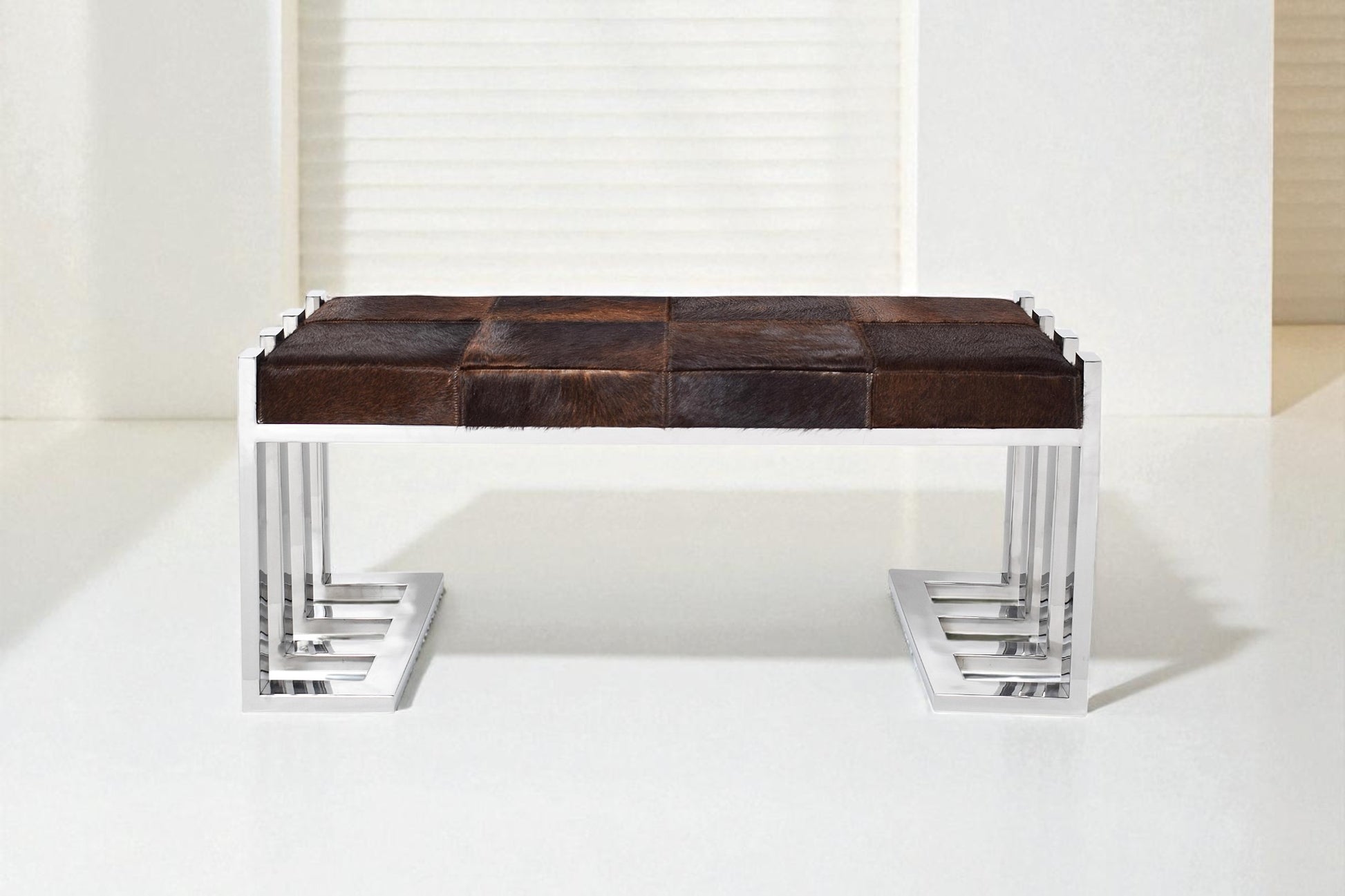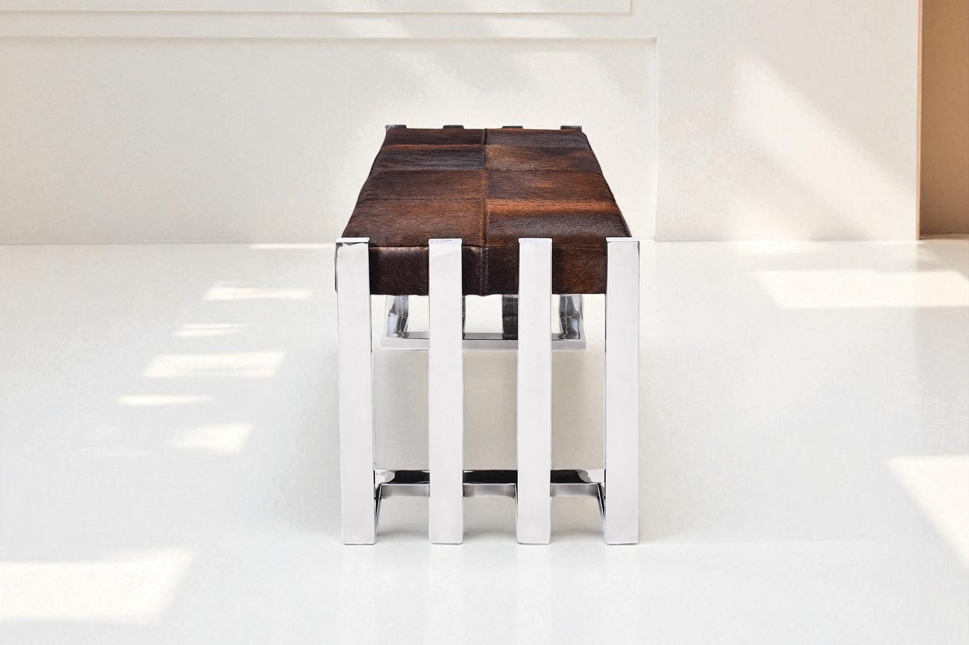 Double bench upholstered in light brown hide seat and high polished stainless steel legs in rich contemporary design.