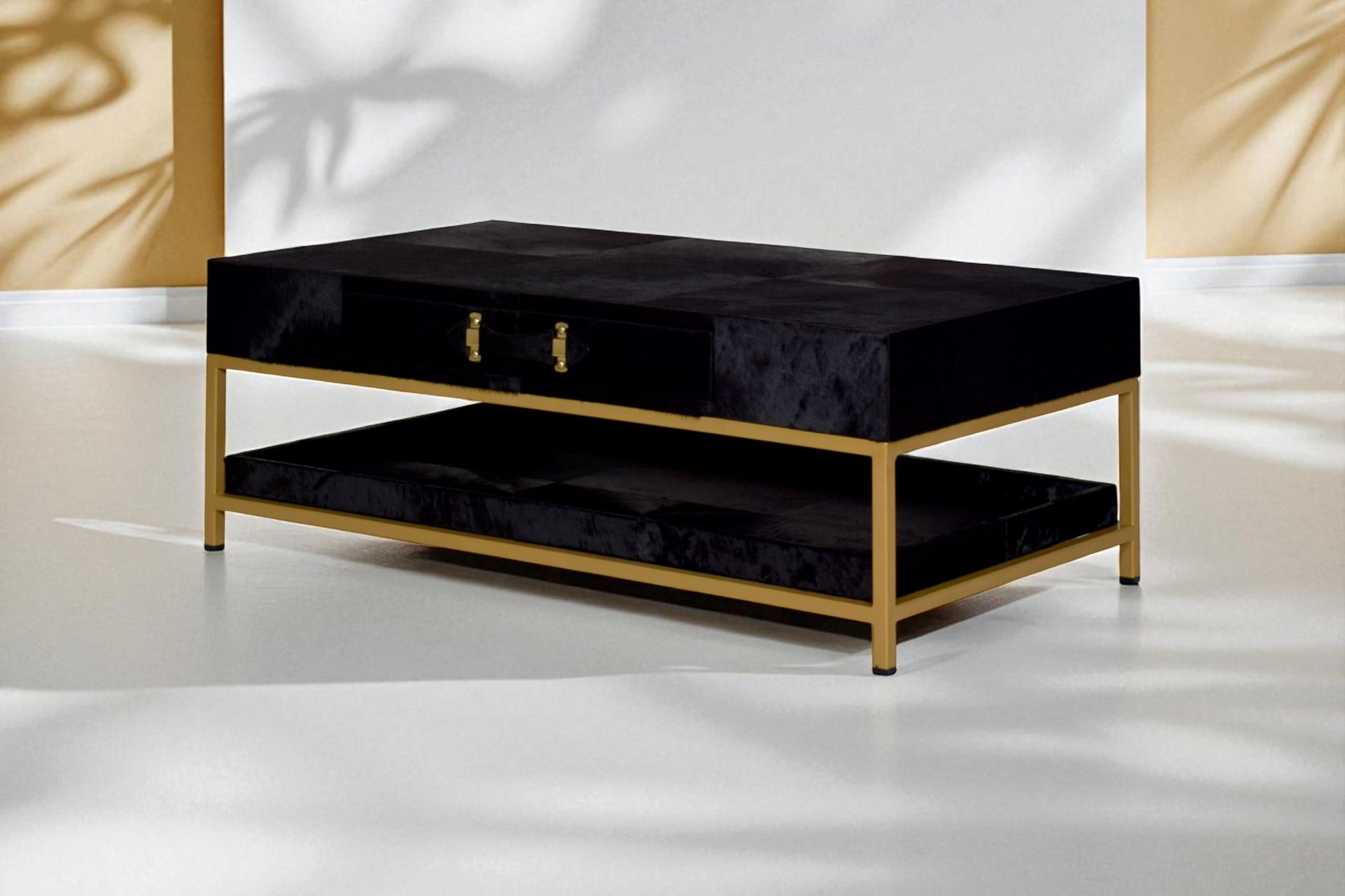 Coffee table with low height in black hair on and base in suede. The table has 1 drawer with frame & legs in stainless steel matt gold finish. This table makes a true focal point in any modern, contemporary or eclectic décor.