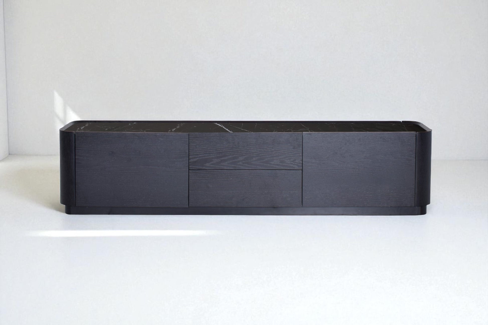 TV Unit delivers a bold aesthetic with its painted dark veneer finish and contrasting imitation marble top. Designed with clean lines and a matte black base, this piece blends contemporary form with timeless material accents.