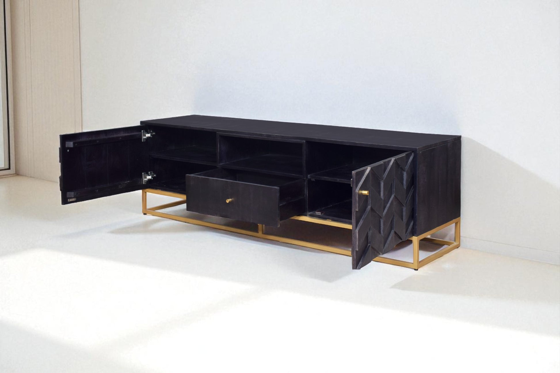 This gorgeous solid wood TV unit with door in geometric design & one drawer in black matt polish & matt gold stainless steel with storage is a perfect statement piece in your living room.
