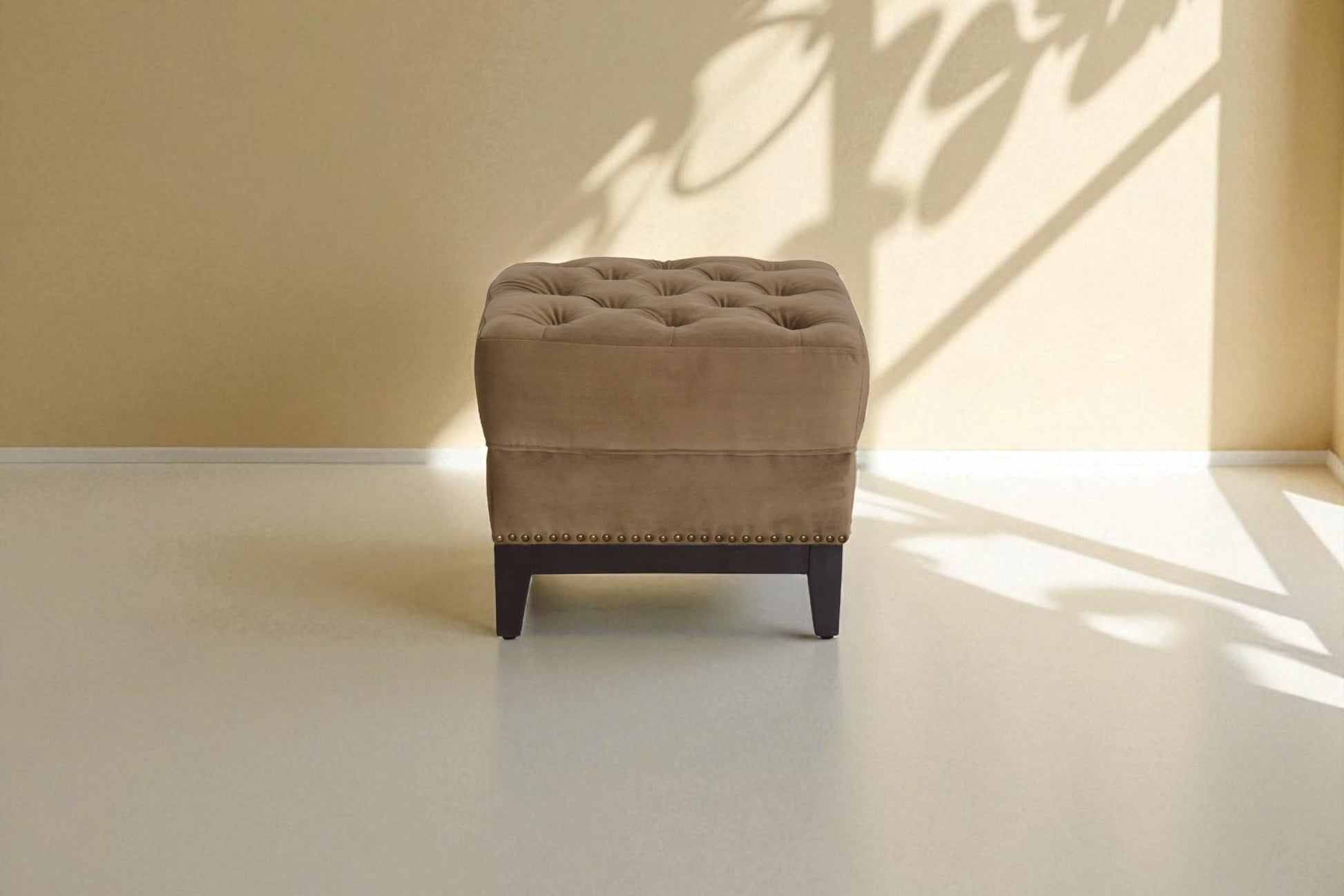 Ottoman upholstered in velvet fabric fully tufted with walnut wood legs which offers a contemporary glamorous touch highlighting your decor space.
